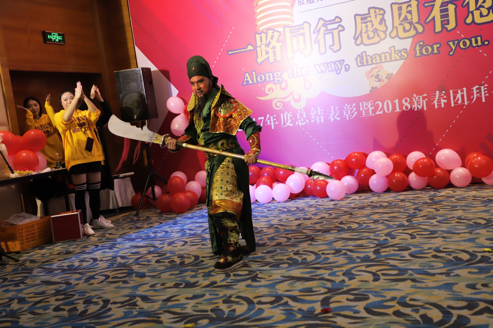 公司员工精心准备了丰富多彩的表演节目,有歌曲、舞蹈、诗歌朗诵、抽奖等等,还有文武双全的关公助阵。