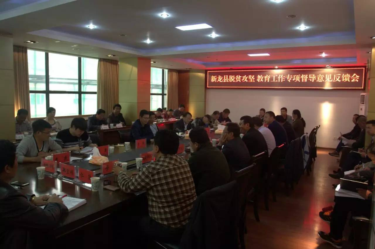 工作组在新龙县召开了脱贫攻坚和教育工作专项督导意见反馈会。会议首先由州教育局、州水务局、州司法局联合工作组对新龙县脱贫攻坚工作督导情况进行了反馈;新龙县对义务教育均衡发展情况作了详细汇报;州教育局何光良总督学对义务教育均衡发展达标工作从提高认识、认清现状、下步建议方面作了发言;徐杰局长充分肯定了新龙县这些年在抓教育方面取得的长足进步,并对新龙县2018年接受省级验收存在的困难和问题提出要求,一要加大宣传力度,全面启动迎检工作,做到家喻户晓;二要加快新龙中学迁建进度,举全县之力如期完成学校工程建设,确保在迎检前学生能进入新校区就学;三要狠抓教师队伍的培训,建强师资队伍,提高教育教学质量;四要狠抓教学管理,以学校精细化管理为抓手,推动学校各项工作再上新台阶、新水平。州人大杨志贵副主任重点从脱贫攻坚和维稳工作方面提出了工作要求;新龙县人民政府董德洪县长作了表态发言,表示一定努力,完成义务教育均衡发展达标迎检工作,同时对脱贫攻坚和维稳工作进行了再动员再部署。